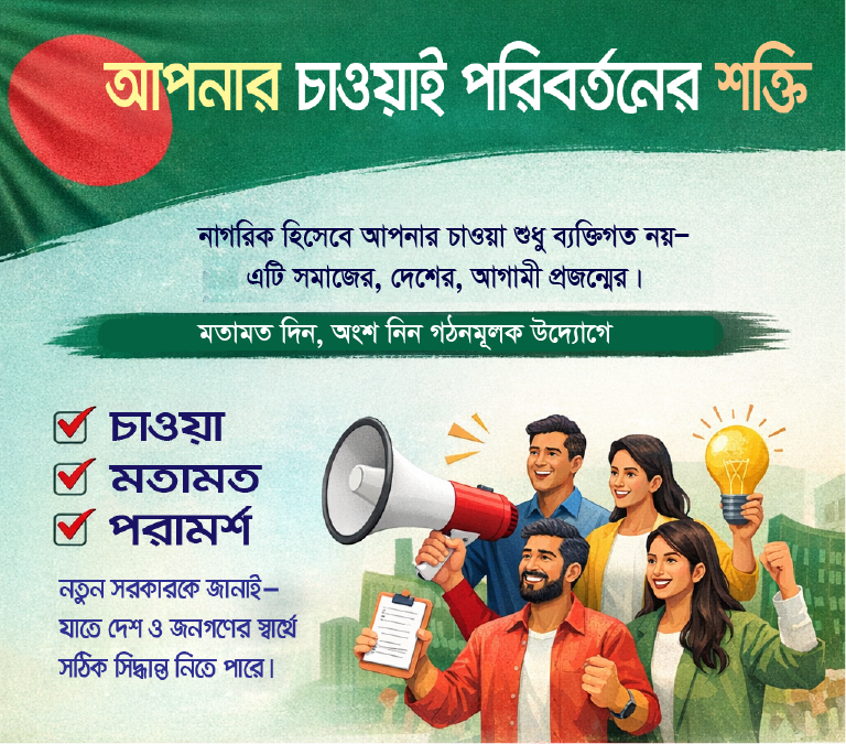 ত্রয়োদশ জাতীয় সংসদ নির্বাচন শেষে গঠিত সরকারের মন্ত্রিপরিষদের কাছে আপনার চাওয়া তুলে ধরুন।